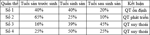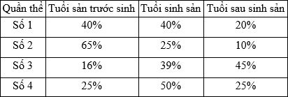 Xét 4 quần thể của cùng một loài sống ở 4 hồ tự nhiên. Tỉ lệ % cá thể của mỗi nhóm tuổi ở mỗi quần thể như sau: