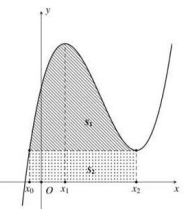Cho hàm số bậc ba y = f(x) có đồ thị là đường cong ở hình bên dưới. Gọi \({x_1},\,\,{x_2}\) là hai điểm cực trị thỏa mãn \({x_2} = {x_1} + 2\) và \(f\left( {{x_1}} \right) - 4f\left( {{x_2}} \right) = 0\). Đường thẳng song song với trục Ox và qua điểm cực tiểu cắt đồ thị hàm số tại điểm thứ hai có hoành độ \({x_0}\) và \({x_1} = {x_0} + 1\). Tính tỉ số \(\dfrac{{{S_1}}}{{{S_2}}}\) (\({S_1}\) và \({S_2}\) lần lượt có diện tích hai hình phẳng được gạch ở hình bên dưới).