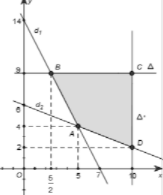 Vẽ các đường thẳng \({d_1}:\,\,2x + y - 14 = 0\), \({d_2}:\,\,2x + 5y - 30 = 0\), \(\Delta :\,\,y = 9\), \(\Delta ':\,\,x = 10\)