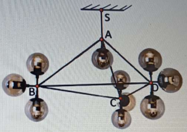 b) Biết tổng khối lượng của các cạnh của và 9 bóng đèn là \(5\;{\rm{kg}}\), bỏ qua khối lượng của các dây \(AB,AC,AD\). Tính lực căng trên dây \(AB\)