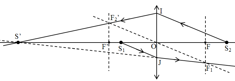 Hai điểm sáng \({S_1}\) và \({S_2}\) cùng nằm trên trục chính, ở về hai bên của thấu kính hội