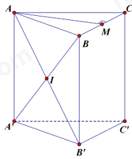 Cho lăng trụ tam giác đều ABC.A’B’C’ có AB = 2a, \(AA' = a\sqrt 3 \). Gọi I là giao điểm của