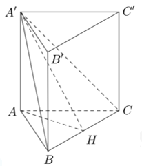 - Gọi \(H\) là chân đường cao kẻ từ \(A\) của tam giác \(ABC\). Xác định \(\left( {\left( {A'BC} \right),\left( {ABC} \right)} \right)\) là góc giữa hai đường thẳng lần lượt thuộc hai mặt phẳng và cùng vuông góc với giao tuyến.