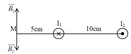 Hai dây dẫn thẳng, rất dài, đặt song song, cách nhau 10cm trong không khí, có hai dòng điện ngược chiều, có cường độ \({I_1} = 6A;\,\,{I_2} = 12A\) chạy qua. Xác định cảm ứng từ tổng hợp do hai dòng điện này gây ra tại điểm M cách dây dẫn mang dòng \({I_1}\) 5 cm và cách dây dẫn mang dòng \({I_2}\) 15cm.