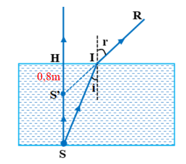 Một người đặt mắt gần sát mặt nước nhìn một hòn đá nhỏ dưới đáy một cái bể, thấy hòn đá dường như cách mặt nước khoảng 0,8m. Biết chiết suất của nước là \(\dfrac{4}{3}\), người đó nhìn hòn đá dưới góc \({60^0}\) so với pháp tuyến. Tính chiều sâu thực của bể nước?