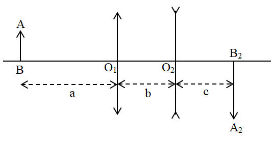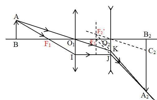 Một quang hệ gồm một thấu kính hội tụ và một thấu kính phân kì đặt cùng trục chính với nhau \({O_1}{O_2} = b = 4cm\). Quang hệ này tạo ảnh của một vật AB đặt cách thấu kính hội tụ một khoảng a = 6cm cho ảnh thật cuối cùng \({A_2}{B_2}\) nằm cách thấu kính phân kì một khoảng c = 4cm (hình vẽ). Cho biết \(\dfrac{{{A_2}{B_2}}}{{AB}} = k = 4\). Bằng phép vẽ, hãy xác định tiêu điểm chính của cả hai thấu kính và tìm tiêu cự của hai thấu kính.