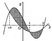 Cho hai hàm số \(f\left( x \right) = a{x^3} + b{x^2} + cx + \dfrac{3}{4}\) và \(g\left( x \right) = d{x^2} + ex - \dfrac{3}{4}\) với \(a,b,c,d,e \in \mathbb{R}\). Biết rằng đồ thị của hàm số f(x) và g(x) cắt nhau tại ba điểm có hoành độ lần lượt là -2; 1; 3 (như hình vẽ bên dưới). Tính diện tích S của hình phẳng giới hạn bởi hai đồ thị đã cho.