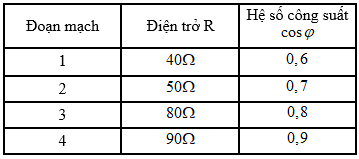 Khi làm thí nghiệm đo công suất tiêu thụ của dòng điện xoay chiều, một học sinh lần lượt đặt cùng một điện áp xoay chiều \(u = U\sqrt 2 \cos \left( {\omega t + {\varphi _u}} \right)V\) vào bốn đoạn mạch gồm R,L,C mắc nối tiếp khác nhau, kết quả thu được thể hiện ở bảng sau: