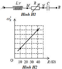 Đặt điện áp xoay chiều \(u = {U_0}\cos \left( {\omega t} \right)\) (\({U_0}\) không đổi, \(\omega \) thay đổi được) vào hai đầu đoạn mạch AB như Hình \({H_1}\), trong đó R là biến trở có giá trị thay đổi được. Điện áp hiệu dụng giữa hai đầu đoạn mạch AN không phụ thuộc vào R khi thay đổi R. Ứng với mỗi giá trị của R, điều chỉnh \(\omega = {\omega _R}\) sao cho điện áp tức thời giữa hai đầu đoạn mạch AM và điện áp tức thời giữa hai đầu đoạn mạch AB vuông pha nhau. Hình \({H_2}\) biểu diễn sự phụ thuộc của \(\omega _R^2\) theo R. Gọi \({\omega _1}\) và \({\omega _2}\) lần lượt là tần số góc khi \(R = 20\Omega \) và \(R = 95\Omega \). Tỉ số \(\dfrac{{{\omega _1}}}{{{\omega _2}}}\) bằng