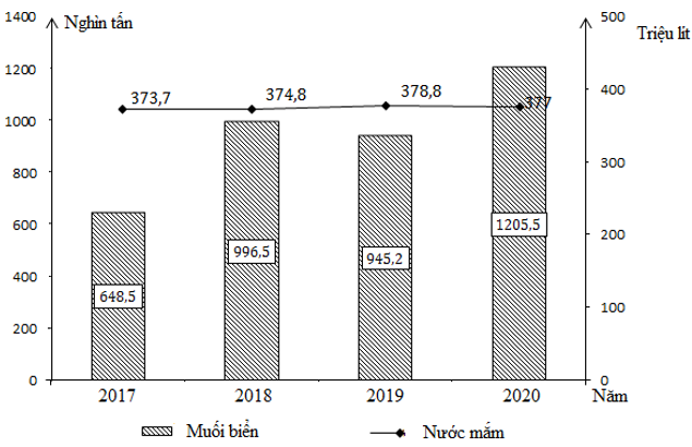 Cho biểu đồ về muối biển và nước mắm của nước ta giai đoạn 2017 - 2020:Biểu đồ thể
