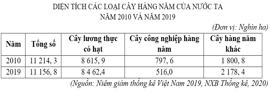 Cho bảng số liệu:Theo bảng số liệu, để so sánh diện tích các loại cây hàng năm của nước