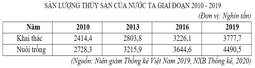 Theo bảng số liệu, nhận xét nào sau đây đúng về sản lượng thủy sản của nước ta giai đoạn 2010 – 2019?