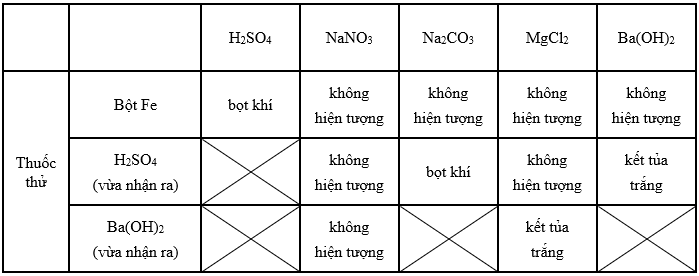 Chỉ dùng thêm bột sắt làm thuốc thử, hãy trình bày phương pháp hóa học để phân biệt 5 dung dịch loãng chứa trong các lọ riêng biệt sau: H2SO4, NaNO3, Na2CO3, MgCl2, Ba(OH)2. Viết phương trình hóa học xảy ra.
