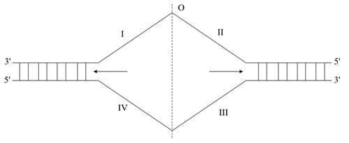 Cho một đoạn ADN ở khoảng giữa của một đơn vị nhân đôi như hình vẽ (trong đó O là điểm khởi đầu sao chép, I – II – III – IV chỉ các đoạn mạch đơn của ADN). Trong các phát biểu dưới đây, có bao nhiêu phát biểu đúng?