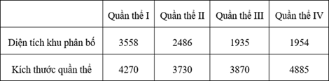 Giả sử kết quả khảo sát về diện tích khu phân bố (tính theo m) và kích thước quần thể (tính theo số lượng cá thể) của 4 quần thể sinh vật cùng loài ở cùng một thời điểm như sau: