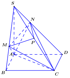 Cho hình chóp \(S.ABCD\) có đáy là hình chữ nhật, cạnh bên \(SA\) vuông góc với mặt phẳng \(\left( {ABCD} \right)\), \(AB = \sqrt 5 \), \(AD = \sqrt 2 \), \(SA = \sqrt 3 \). Gọi \(M\), \(N\) lần lượt là hình chiếu của \(A\) trên \(SB\), \(SD\) và \(P\) là điểm nằm trên cạnh \(SC\) sao cho \(2SP = 3PC\). Thể tích của khối đa diện \(ACMPN\) là