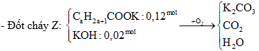 X là hợp chất có công thức CaH2a+1COOCbH2b+1. Xà phòng hóa hoàn toàn m gam X bằng 28,0 gam dung dịch KOH 28%. Cô cạn hỗn hợp sau phản ứng rồi ngưng tụ phần hơi, thu được chất rắn khan Z và 25,68 gam chất lỏng Y. Đốt cháy hoàn toàn Z, thu được sản phẩm gồm CO2, H2O và K2CO3, trong đó tổng khối lượng CO2 và H2O là 18,34 gam. Mặt khác, cho Y tác dụng Na dư thì thu được 13,888 lít khí H2 (ở đktc). Xác định công thức X và tính m.