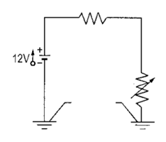 Một đồng hồ xăng cho một xe ô tô có giản đồ như hình vẽ. Chỉ thị ở trên bảng điều khiển có điện trở \(10\Omega \). Phần nằm trong bình xăng đơn giản là một phao nối với điện trở có giá trị thay đổi được một cách tuyến tính theo thể tích của xăng từ \(20\Omega \) khi bình đầy đến \(140\Omega \), khi hết xăng. Tính dòng điện trong mạch khi bình đầy một nửa.