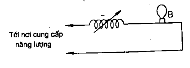 Một bộ “ánh sáng mờ” điển hình thường dùng để làm tối dần các đèn trong rạp hát gồm một cuộn cảm có độ tự cảm L thay đổi được (từ 0 đến \({L_{\max }}\)), mắc nối tiếp với một bóng đèn B như hình vẽ. Nguồn điện là 120V ở tần số 60,0Hz. Bóng đèn ghi 120V – 1000W. Tính giá trị \({L_{\max }}\) để tốc độ tiêu tán năng lượng trên bóng đèn có thể thay đổi được 5 lần. Cho rằng điện trở của bóng đèn không phụ thuộc vào nhiệt độ.