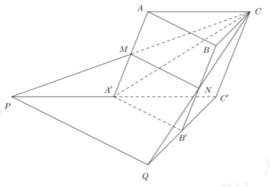 - Tính tỉ số thể tích của \(\dfrac{{{V_{CC'PQ}}}}{{{V_{CA'B'C'}}}}\) từ đó tính được \({V_{CC'PQ}}\).