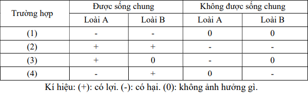Bảng dưới đây mô tả sự biểu hiện các mối quan hệ sinh thái giữa 2 loài sinh vật A và B:Theo