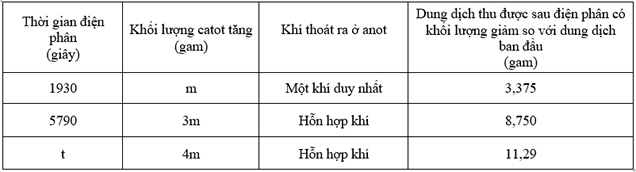 Điện phân dung dịch chứa đồng thời NaCl và CuSO4 (điện cực trơ, màng ngăn xốp, hiệu suất điện phân 100%, bỏ qua sự hòa tan của khí trong nước và sự bay hơi của nước) với cường độ dòng điện không đổi. Kết quả của thí nghiệm được ghi ở bảng sau: