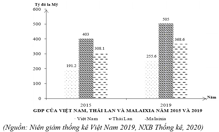 Theo biểu đồ, nhận xét nào sau đây đúng khi so sánh về GDP của Việt Nam, Thái Lan và Malaixia năm 2015 và 2019?
