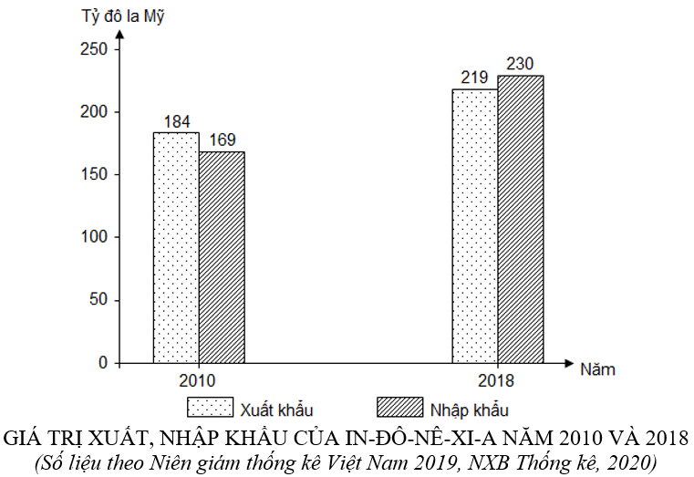 Theo biểu đồ, nhận xét nào sau đây đúng về sự thay đổi giá trị xuất, nhập khẩu năm 2018 so với năm 2010 của In-đô-nê-xi-a?