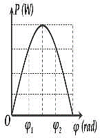 Một mạch điện gồm biến trở R, tụ điện C và cuộn cảm thuần L mắc nối tiếp. Thay đổi giá trị của R người ta vẽ được đồ thị thể hiện mối liên hệ giữa công suất của mạch và độ lệch pha \(\varphi \) của điện áp hai đầu mạch so với dòng điện như hình vẽ. Hiệu số \({\varphi _2} - {\varphi _1}\) gần giá trị nào nhất sau đây?