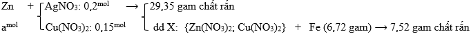 Cho a mol Zn vào dung dịch chứa 0,2 mol AgNO3 và 0,15 mol Cu(NO3)2. Sau một thời gian thu được 29,35 gam chất rắn và dung dịch X chứa 2 muối. Tách riêng chất rắn, thêm tiếp 6,72 gam bột Fe vào X, phản ứng xảy ra hoàn toản thu được 7,52 gam chất rắn. Giá trị của a là
