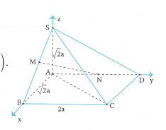 Cách 2: Sử dụng phương pháp tọa độ hóa: \(A\left( {0;0;0} \right),\,B\left( {\sqrt 2 ;0;0} \right),\,C\left( {\sqrt 2 ;2;0} \right),\,D\left( {0;2;0} \right),\,S\left( {0;0;\sqrt 2 } \right)\)