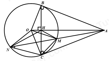 Cho \(\left( {O;R} \right)\) và điểm \(A\) cố định bên ngoài \(\left( O \right)\). Qua \(A\) kẻ đường thẳng \(d\) cắt \(\left( O \right)\) tại \(M,N\left( {AM < AN} \right)\). Kẻ tiếp tuyến \(AB,AC\) tới \(\left( O \right),\left( {B,C} \right.\) là hai tiếp điểm và \(B\) thuộc cung lớn \(\left. {MN} \right)\). Gọi \(H\) là giao điểm \(AO\) và \(BC.\)