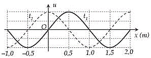 Trên một sợi dây đàn hồi dài nằm ngang có một sóng ngang hình sin truyền qua. Hình dạng của một đoạn dây tại hai thời điểm \({t_1}\) (nét liền) và \({t_2}\) (nét đứt) có dạng như hình vẽ bên. Biết \({t_2} - {t_1} = 0,75{\rm{s}}\). Kết luận nào sau đây là đúng?