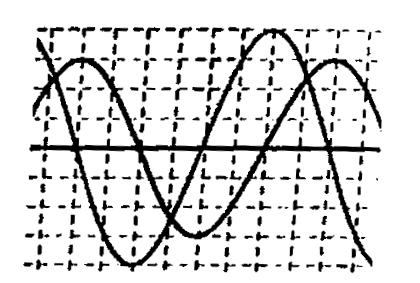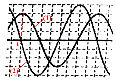Để xác định độ tự cảm của một cuộn cảm thuần, một học sinh mắc cuộn cảm này với một điện trở \(R = 30\Omega \) rồi mắc hai đầu mạch vào nguồn điện xoay chiều. Dùng dao động kí điện tử để hiển thị đồng thời đồ thị điện áp tức thời giữa hai đầu cuộn cảm và điện áp tức thời giữa hai đầu điện trở R thì cho kết quả như hình bên (các đường hình sin). Biết dao động kí đã được chỉnh sao cho ứng với mỗi ô vuông trên màn hình thì cạnh nằm ngang là 0,004 s và cạnh thẳng đứng là 10 V. Độ tự cảm của cuộn dây là