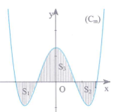 Cho hàm số \(y = {x^4} - 3{{\rm{x}}^2} + m\) có đồ thị \(\left( {{C_m}} \right)\) với m là tham số thực. giả sử \(\left( {{C_m}} \right)\) cắt trục \(Ox\) tại bốn điểm phân biệt như hình vẽ. Gọi \({S_1},{S_2}\) và \({S_3}\) là diện tích các miền gạch chéo được cho trên hình vẽ. Tìm m để \({S_1} + {S_2} = {S_3}\).