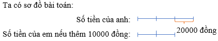 Tính hiệu số tiền của hai anh em lúc đầu và khi em có thêm 10000 đồng. Vẽ sơ đồ của bài toán rồi từ đó tính số tiền của mỗi người và tổng số tiền của hai anh em.
