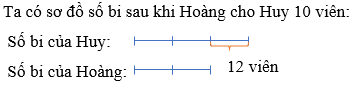 Tính hiệu số bi của hai bạn lúc đầu và sau khi Hoàng cho Huy 10 viên bi, vẽ sơ đồ của bài toán, từ đó tính số bi của Hoàng (hoặc Huy) sau khi Hoàng cho Huy 10 viên bi, rồi tính số bi của mỗi bạn.
