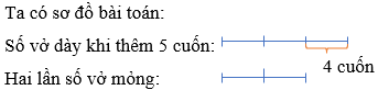 Tính hiệu giữa số vở dày và 2 lần số vở mỏng. Vẽ sơ đồ của bài toán, từ đó tính số vở mỗi loại.