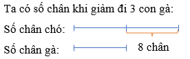 Tính hiệu giữa số chân chó và số chân gà nếu giảm đi 3 con gà. Vẽ sơ đồ của bài toán, từ đó tính số chân chó, số chân gà, rồi tính số con mỗi loại.