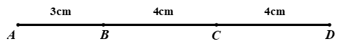 Cho bốn điểm \(A,B,C,D\) thẳng hàng, trong đó \(B\) nằm giữa \(A\) và \(C\), \(C\) nằm giữa \(B\) và \(D\). Độ dài đoạn thẳng \(AB,BC,CD\) lần lượt là \(3cm,4cm\) và \(4cm\). Khẳng định nào dưới đây chính xác?