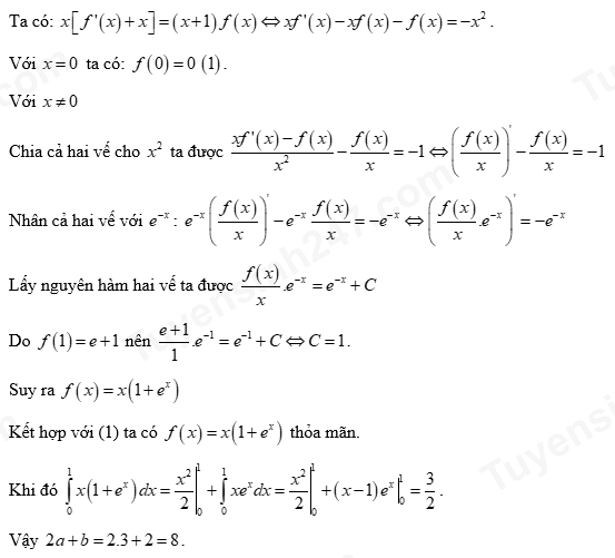 Cho hàm số \(y = f\left( x \right)\) có đạo hàm xác định trên khoảng \(\left[ {0; + \infty } \right)\) và thỏa mãn \(x\left[ {f'\left( x \right) + x} \right] = \left( {x + 1} \right)f\left( x \right);\,\,f\left( 1 \right) = e + 1\). Biết rằng \(\int\limits_0^1 {f\left( x \right)dx} = \dfrac{a}{b}\), trong đó \(a,\,\,b\) là những số nguyên dương và phân số \(\dfrac{a}{b}\) tối giản. Khi đó giá trị của \(2a + b\) tương ứng bằng