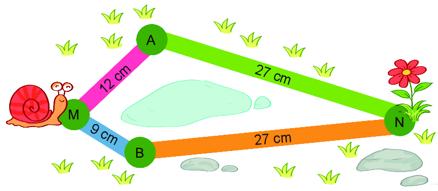 Con ốc sên có thể bò tới bông hoa theo đường gấp khúc MAN hoặc MBN. Hỏi ốc sên bò theo đường nào thì ngắn hơn và ngắn hơn bao nhiêu xăng-ti-mét?