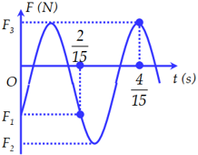 Một con lắc lò xo gồm một vật nhỏ có khối lượng \(m = 200g\) và con lắc lò xo có độ cứng k, đang dao động điều hòa theo phương thẳng đứng. Cho gốc tọa độ ở vị trí cân bằng, chiều dương hướng xuống dưới. Đồ thị biểu diễn sự phụ thuộc của lực đàn hồi theo thời gian được cho như hình vẽ. Biết \({F_1} + 3{F_2} + 6{F_3} = 0\). Lấy \(g = 10\,m/{s^2}\). Tỉ số thời gian lò xo giãn với thời gian lò xo nén trong một chu kì gần giá trị nào nhất sau đây?