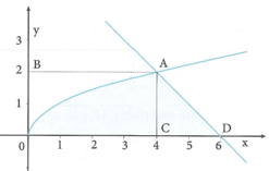 Thể tích của khối tròn xoay tạo thành bằng tổng thể tích khối tròn xoay tạo thành khi quay hình phẳng OAC quanh trục Ox với thể tích khối tròn xoay tạo thành khi quay hình phẳng ACD quanh trục Ox.