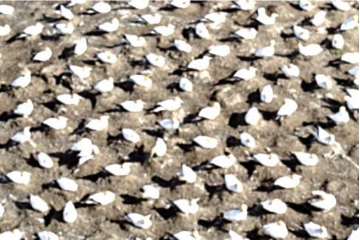 Loài chim biển Morus capensis trong họ Chim điện (Sulidae) có tập tính làm tổ tập đoàn trong mùa sinh sản. Hình ảnh dưới đây mô tả về cách phân bố cá thể của chúng trong mùa sinh sản ở New Zealand.