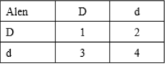 Ở một loài thực vật phổ biến, màu sắc hoa được kiểm soát bởi locus D. Các cây với ít nhất một alen D có hoa màu đỏ, cây có kiểu gen đồng hợp lặn dd có hoa màu trắng. Phép lai cây có hoa màu đỏ thuần chủng với cây có hoa màu trắng được các cây F1. Con lai F2 được xác định bởi bảng dưới đây, trong đó 1, 2, 3 và 4 thể hiện các kiểu gen khác nhau. Những ô nào từ 1 đến 4 tương ứng với kiểu gen quy định cây có hoa màu đỏ?