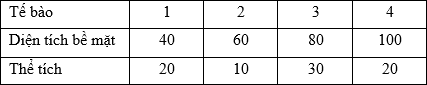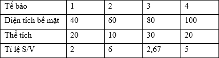 Khả năng trao đổi chất của tế bào với môi trường xung quanh phụ thuộc vào tỉ lệ giữa diện tích bề mặt với thể tích