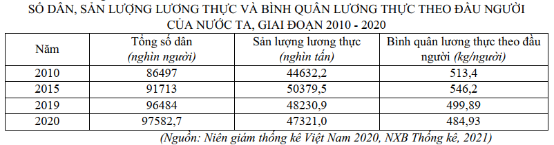 Theo bảng số liệu, để thể hiện tốc độ tăng trưởng tổng số dân, sản lượng lương thực và bình quân lương thực theo đầu người của nước ta giai đoạn 2010 - 2020, dạng biểu đồ nào sau đây là thích hợp nhất?