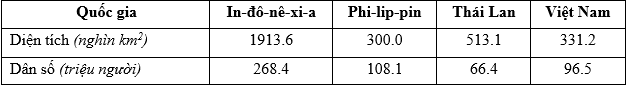 Cho bảng số liệu:DIỆN TÍCH, DÂN SỐ MỘT SỐ QUỐC GIA ĐÔNG NAM Á NĂM 2019(Nguồn: Niên giám