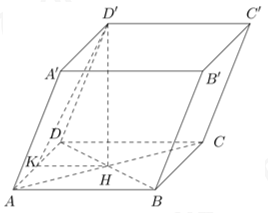 Kẻ \(HK \bot AD\). Khi đó \(\left( {\left( {ADD'A'} \right),\left( {ABCD} \right)} \right) = \angle D'KH = {45^0}\).